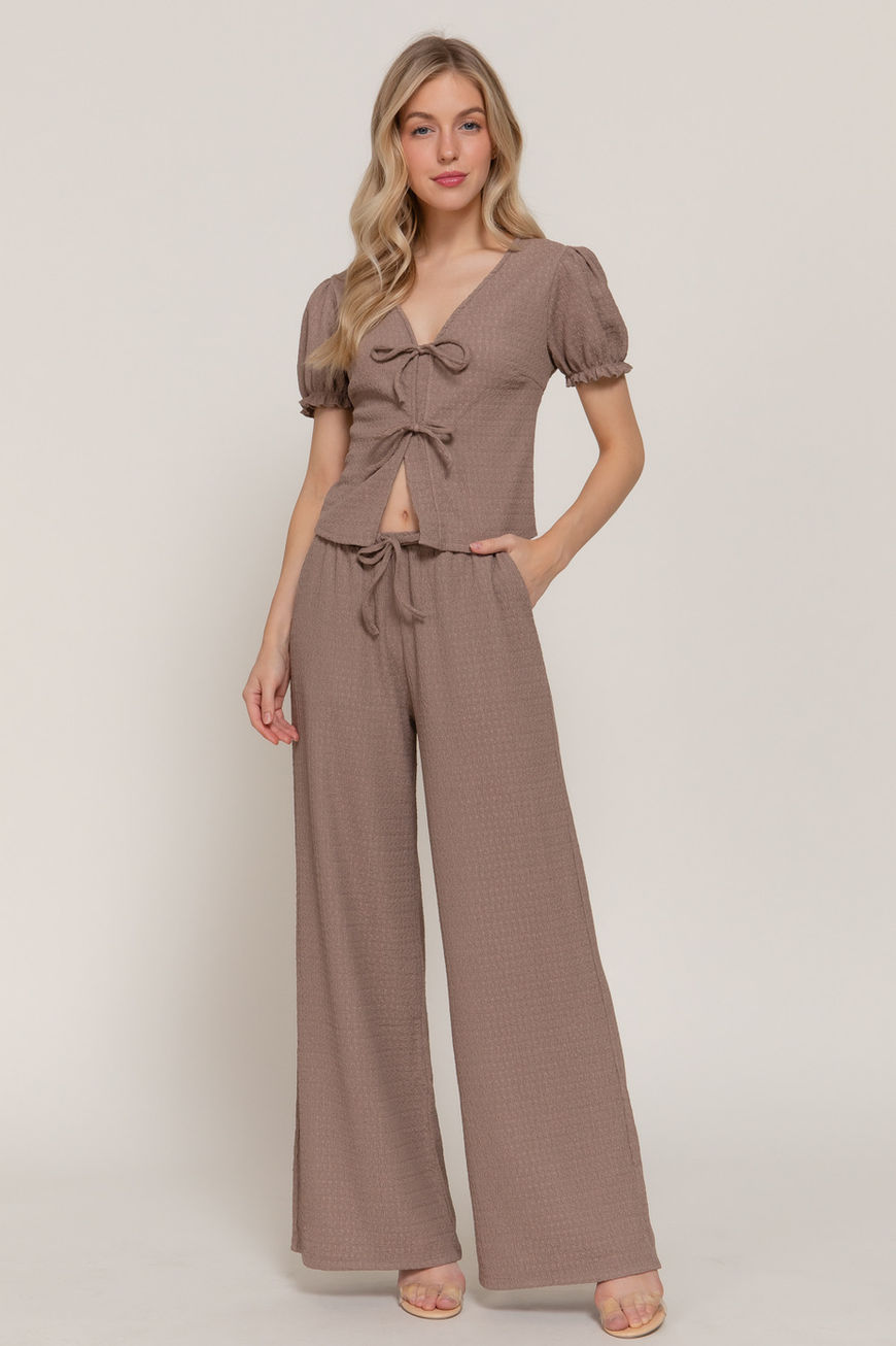 Set de dos piezas con blusa de amarre frontal y pantalón de pierna amplia.